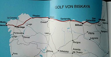 Irun, San Sebastian, Bilbao, Santander, Gijon, Ribadeo von wo es dann zum Camino
